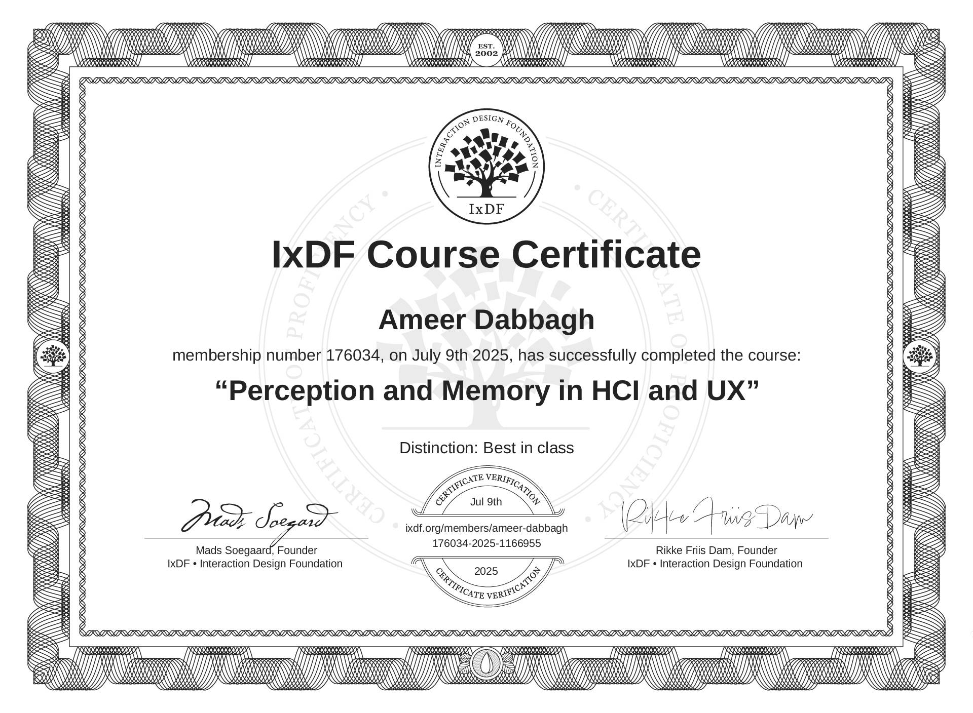 The IxDF Course Certificate (ID #4cb14ba6-8e94-4f66-86c4-2dcf32eb6b54) above is awarded to Ameer Dabbagh with a Best in Class Distinction in formal recognition of their coursework surpassing the rigorous benchmarks of exceptional performance established by the IxDF Educational Codex. View Course Curriculum.