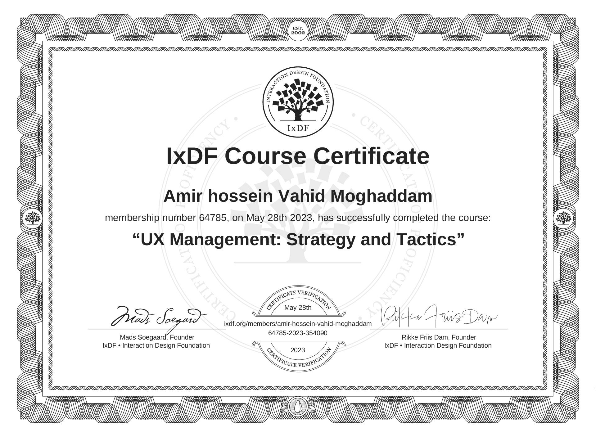 The IxDF Course Certificate (ID #c056977f-1e23-48e9-b570-59ce4f312861) above is awarded to Amir hossein Vahid Moghaddam in formal recognition of their coursework surpassing the rigorous benchmarks of exceptional performance established by the IxDF Educational Codex. View Course Curriculum.