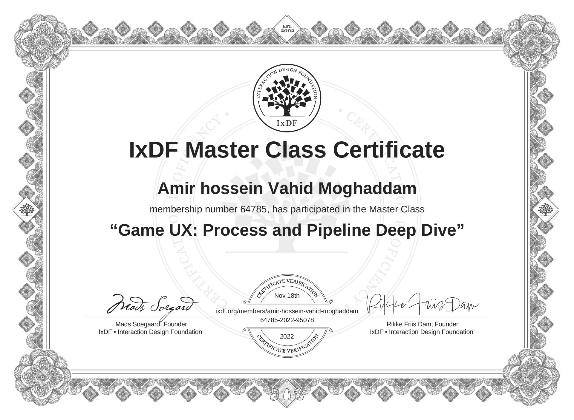 The IxDF Master Class Certificate (ID #mcc_0bf3d1d5894e4bc78105e4c2fbdc8810) above is awarded to Amir hossein Vahid Moghaddam in formal recognition of their participation in the Master Class Game UX: Process and Pipeline Deep Dive .