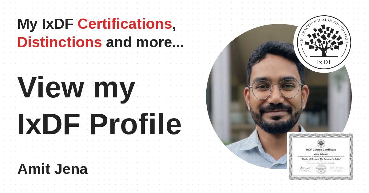 IxDF Course Certificates are awarded to Amit Jena in formal recognition of their coursework surpassing the rigorous benchmarks of exceptional performance established by the IxDF Educational Codex.