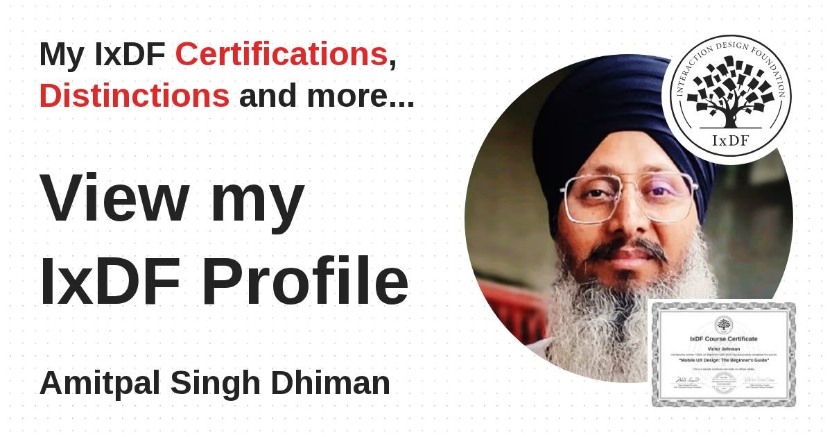IxDF Course Certificates are awarded to Amitpal Singh Dhiman in formal recognition of their coursework surpassing the rigorous benchmarks of exceptional performance established by the IxDF Educational Codex.