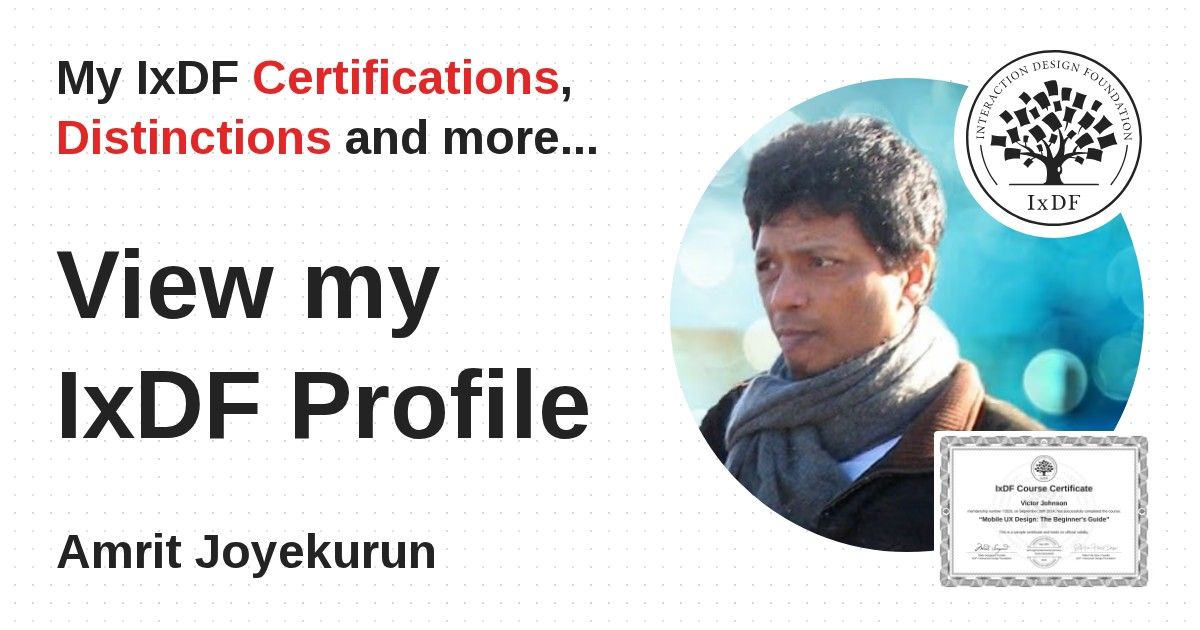 IxDF Course Certificates are awarded to Amrit Joyekurun in formal recognition of their coursework surpassing the rigorous benchmarks of exceptional performance established by the IxDF Educational Codex.