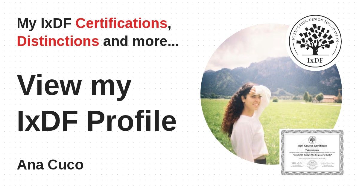 Distinctions are conferred upon Ana Cuco in formal recognition of their notable achievements and contributions, as stipulated by the IxDF Educational Codex.