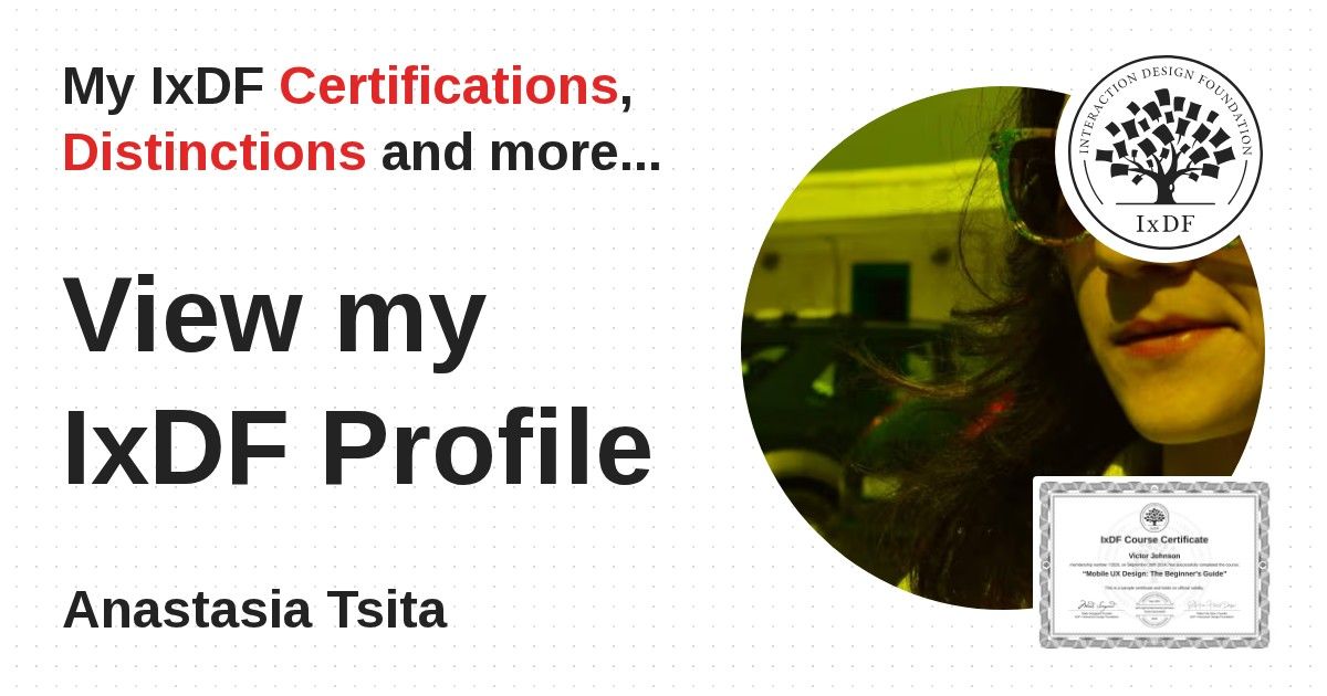 IxDF Course Certificates are awarded to Anastasia Tsita in formal recognition of their coursework surpassing the rigorous benchmarks of exceptional performance established by the IxDF Educational Codex.