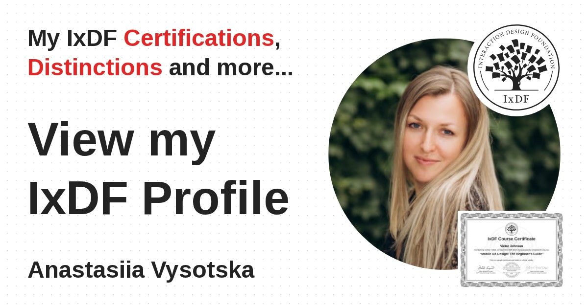 Distinctions are conferred upon Anastasiia Vysotska in formal recognition of their notable achievements and contributions, as stipulated by the IxDF Educational Codex.