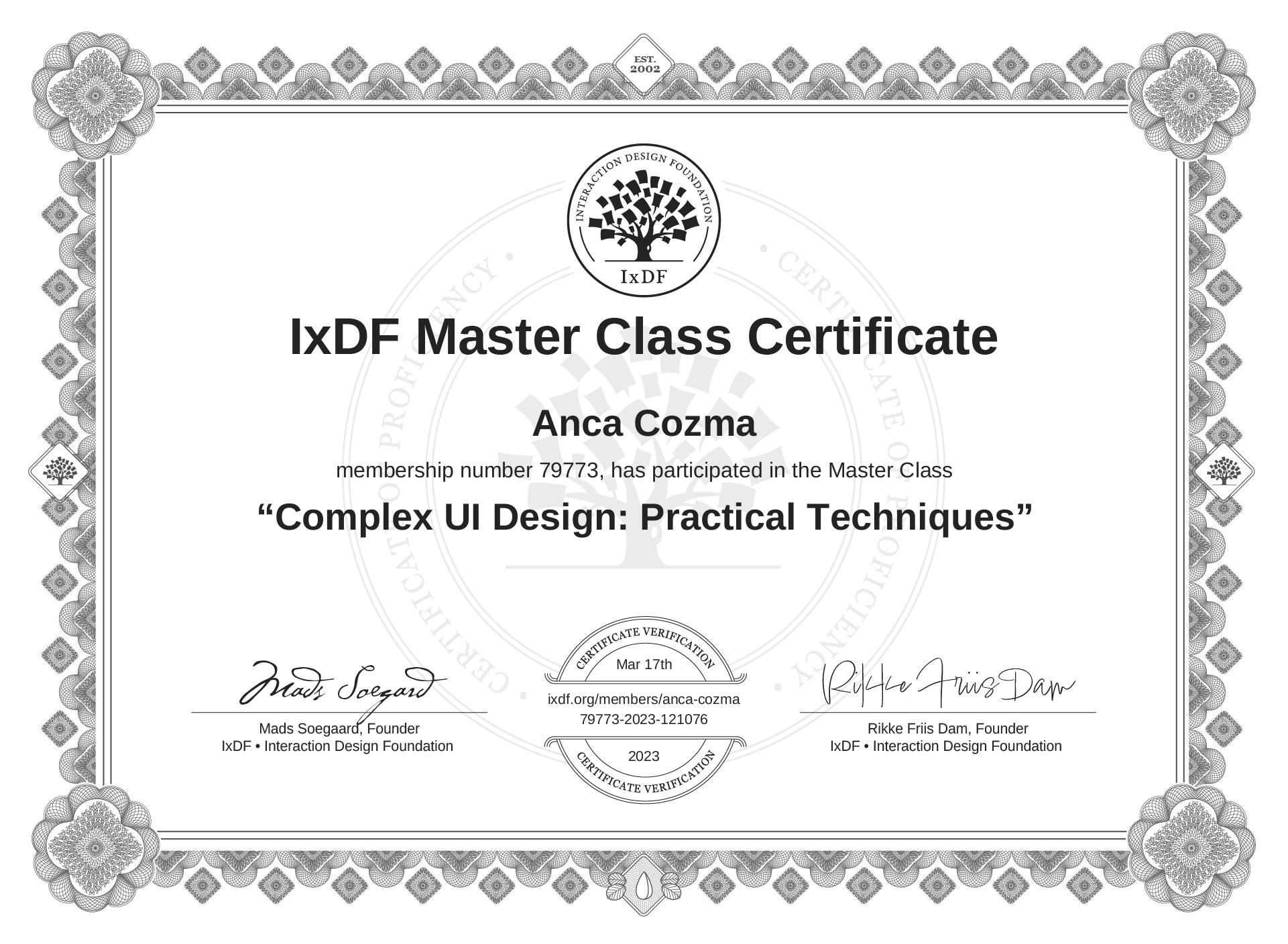 The IxDF Master Class Certificate (ID #mcc_1a108a5ec237454ebe965e05da709857) above is awarded to Anca Cozma in formal recognition of their participation in the Master Class Complex UI Design: Practical Techniques .