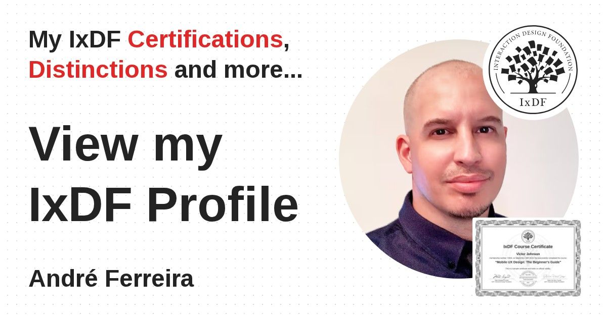 IxDF Course Certificates are awarded to André Ferreira in formal recognition of their coursework surpassing the rigorous benchmarks of exceptional performance established by the IxDF Educational Codex.