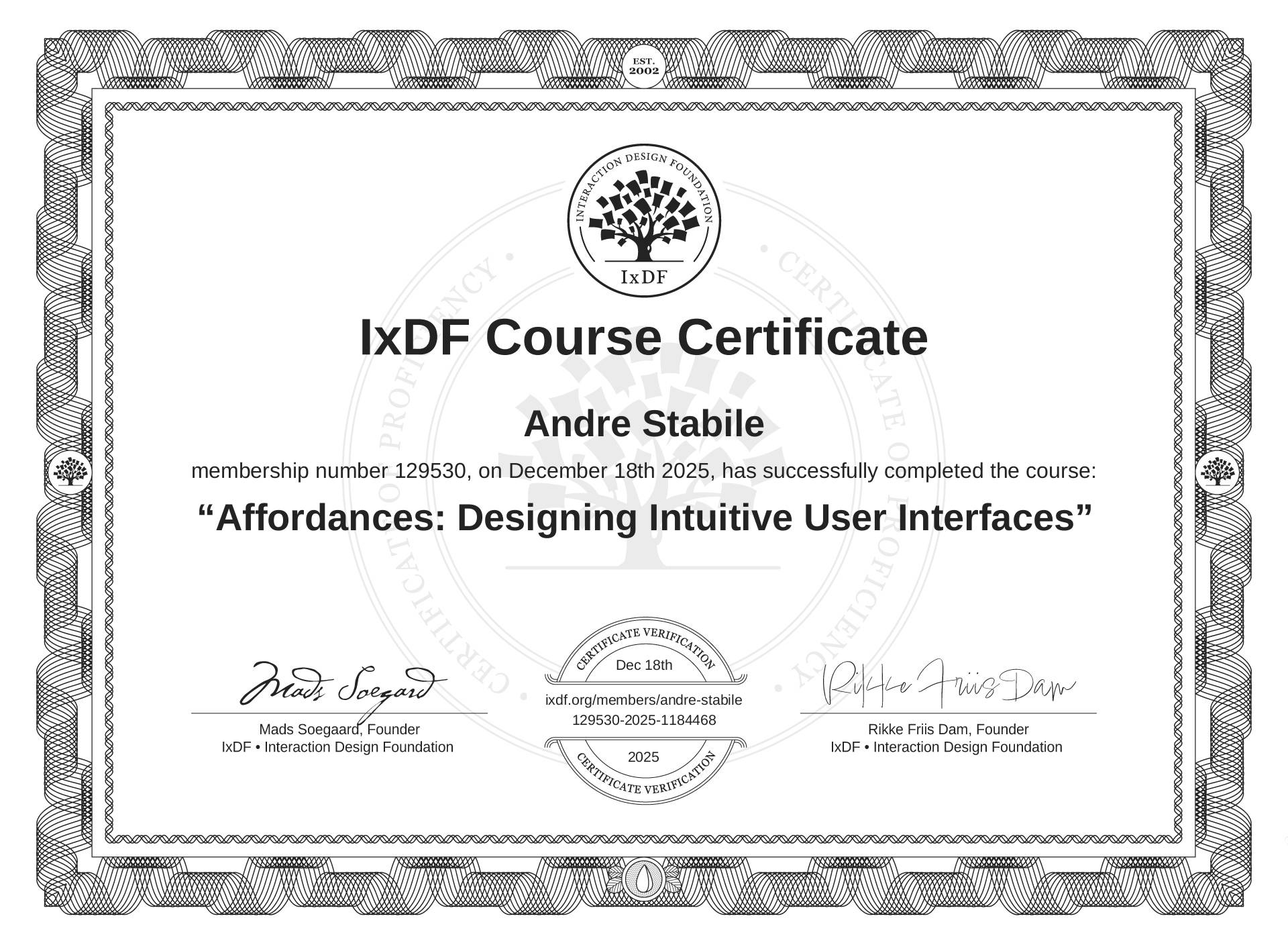 IxDF Course Certificates are awarded to André Stábile in formal recognition of their coursework surpassing the rigorous benchmarks of