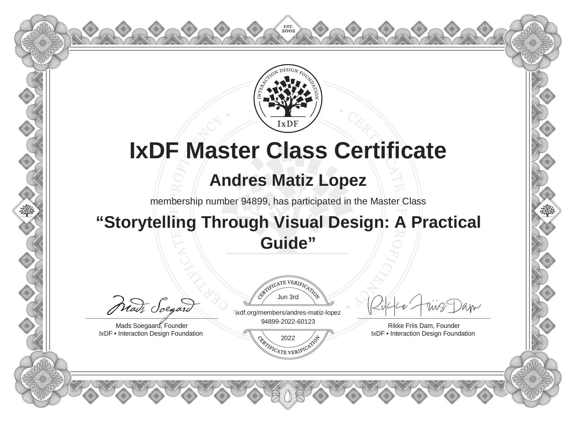 IxDF Master Class Certificates are awarded to Andres Matiz Lopez in formal recognition of their attendance and ongoing commitment to learning from industry leaders.