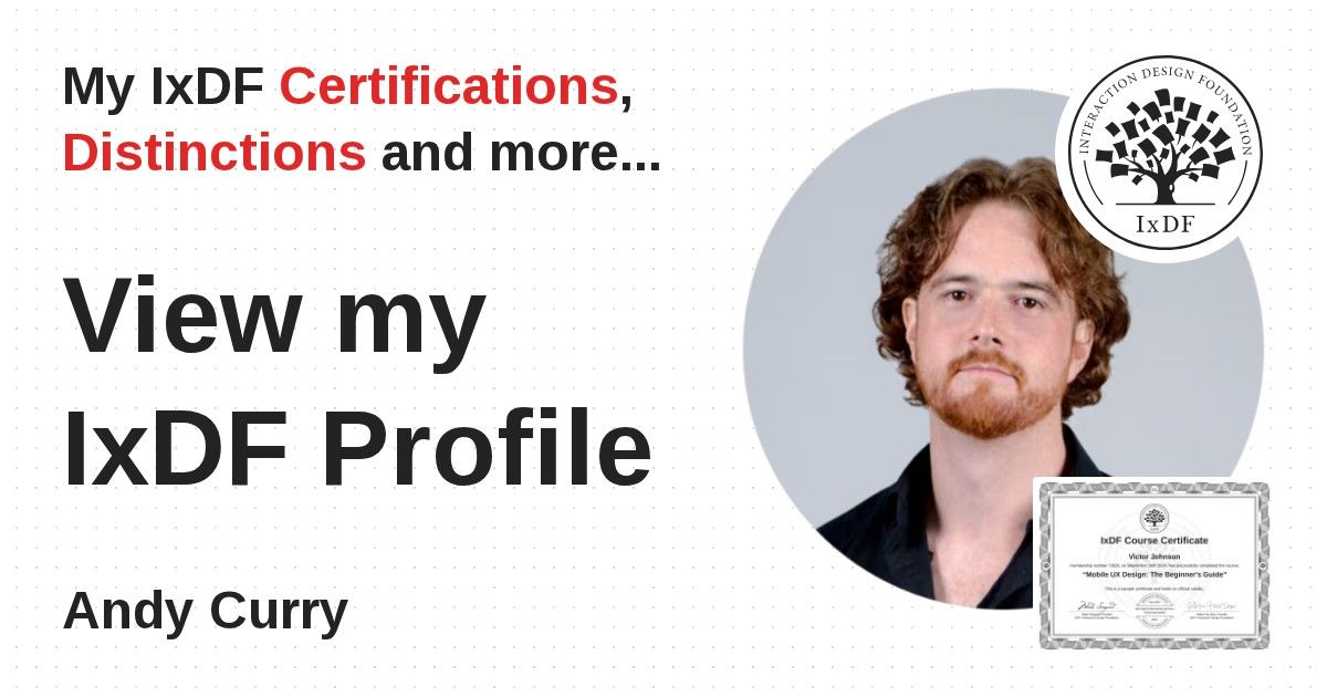 IxDF Course Certificates are awarded to Andy Curry in formal recognition of their coursework surpassing the rigorous benchmarks of exceptional performance established by the IxDF Educational Codex.