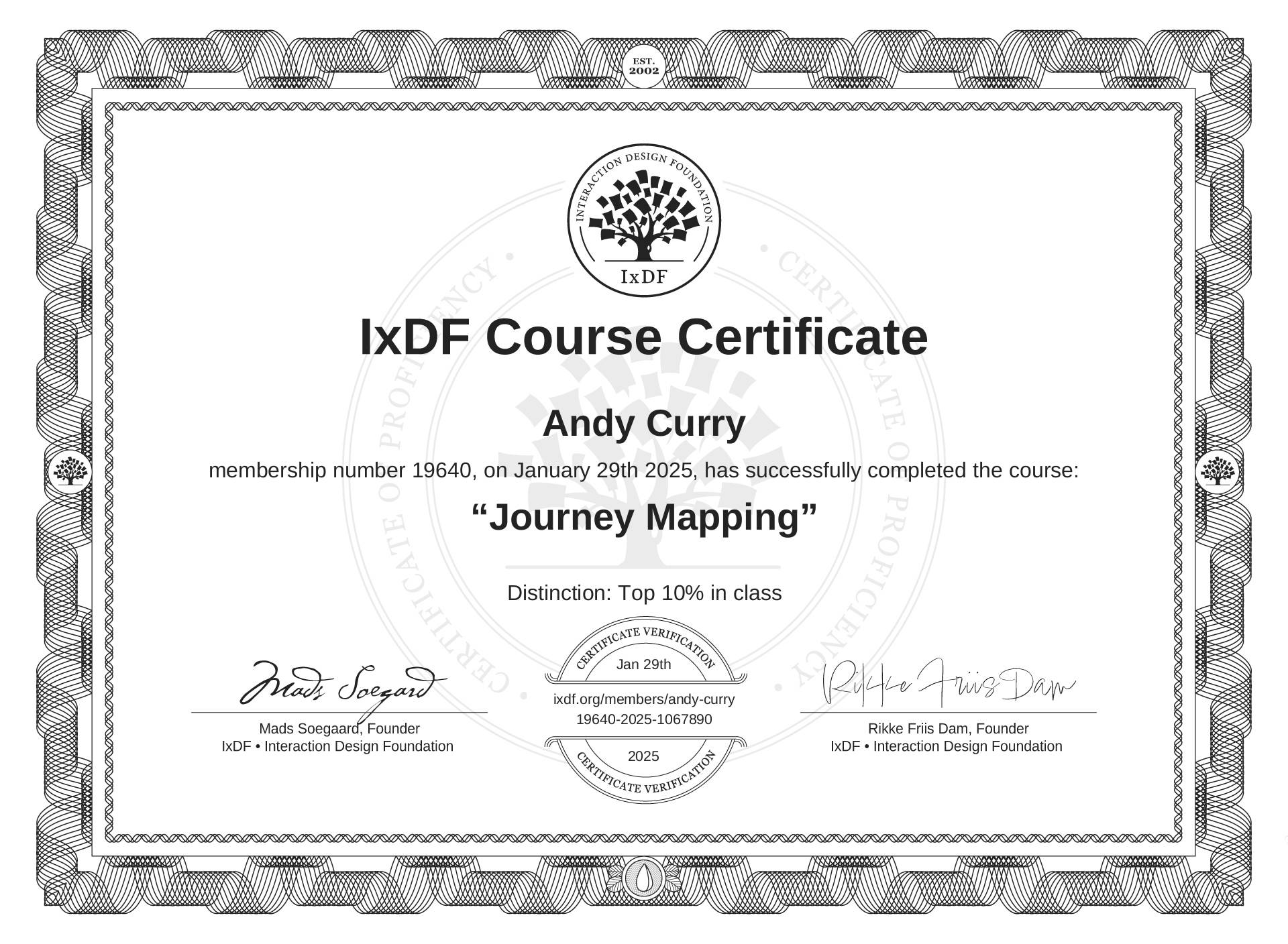 IxDF Course Certificates are awarded to Andy Curry in formal recognition of their coursework surpassing the rigorous benchmarks of exceptional performance established by the IxDF Educational Codex.