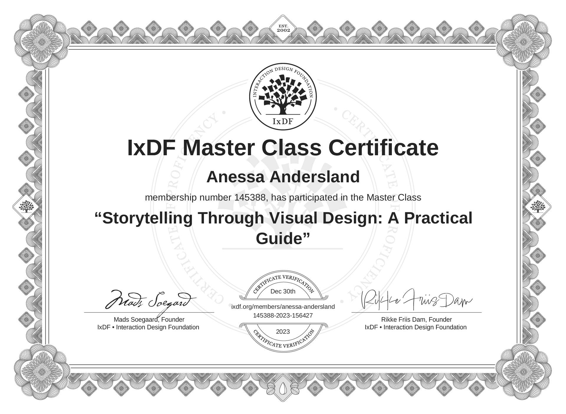The IxDF Master Class Certificate (ID #mcc_7a0a767e50b7431ebb34d9f4ced16064) above is awarded to Anessa Andersland in formal recognition of their participation in the Master Class Storytelling Through Visual Design: A Practical Guide .