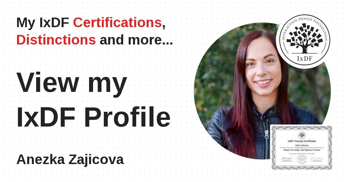 IxDF Course Certificates are awarded to Anezka Zajicova in formal recognition of their coursework surpassing the rigorous benchmarks of exceptional performance established by the IxDF Educational Codex.