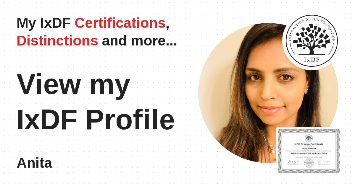 IxDF Course Certificates are awarded to Anita in formal recognition of their coursework surpassing the rigorous benchmarks of exceptional performance established by the IxDF Educational Codex.