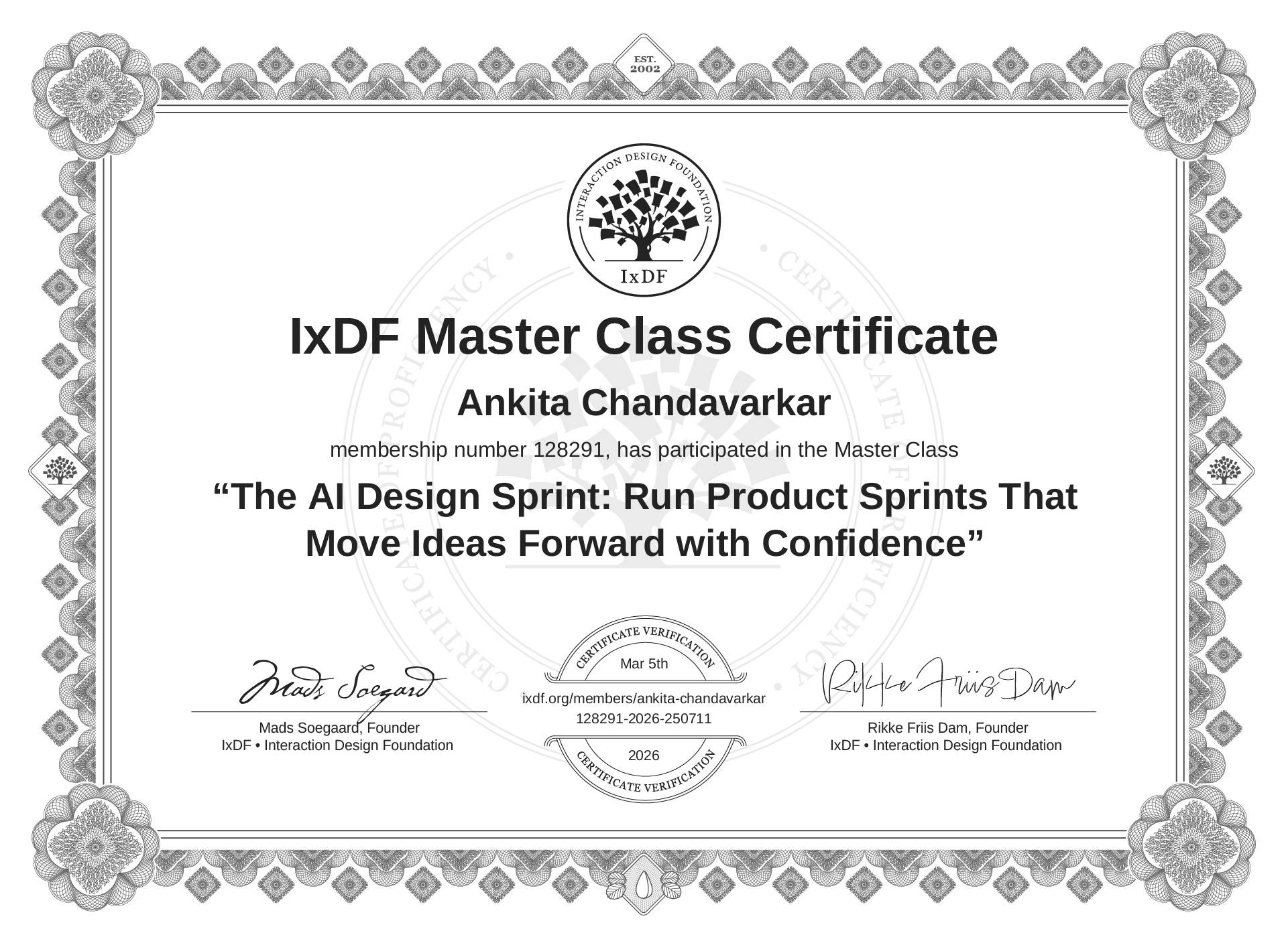 This IxDF Membership Certificate is issued to Ankita Chandavarkar