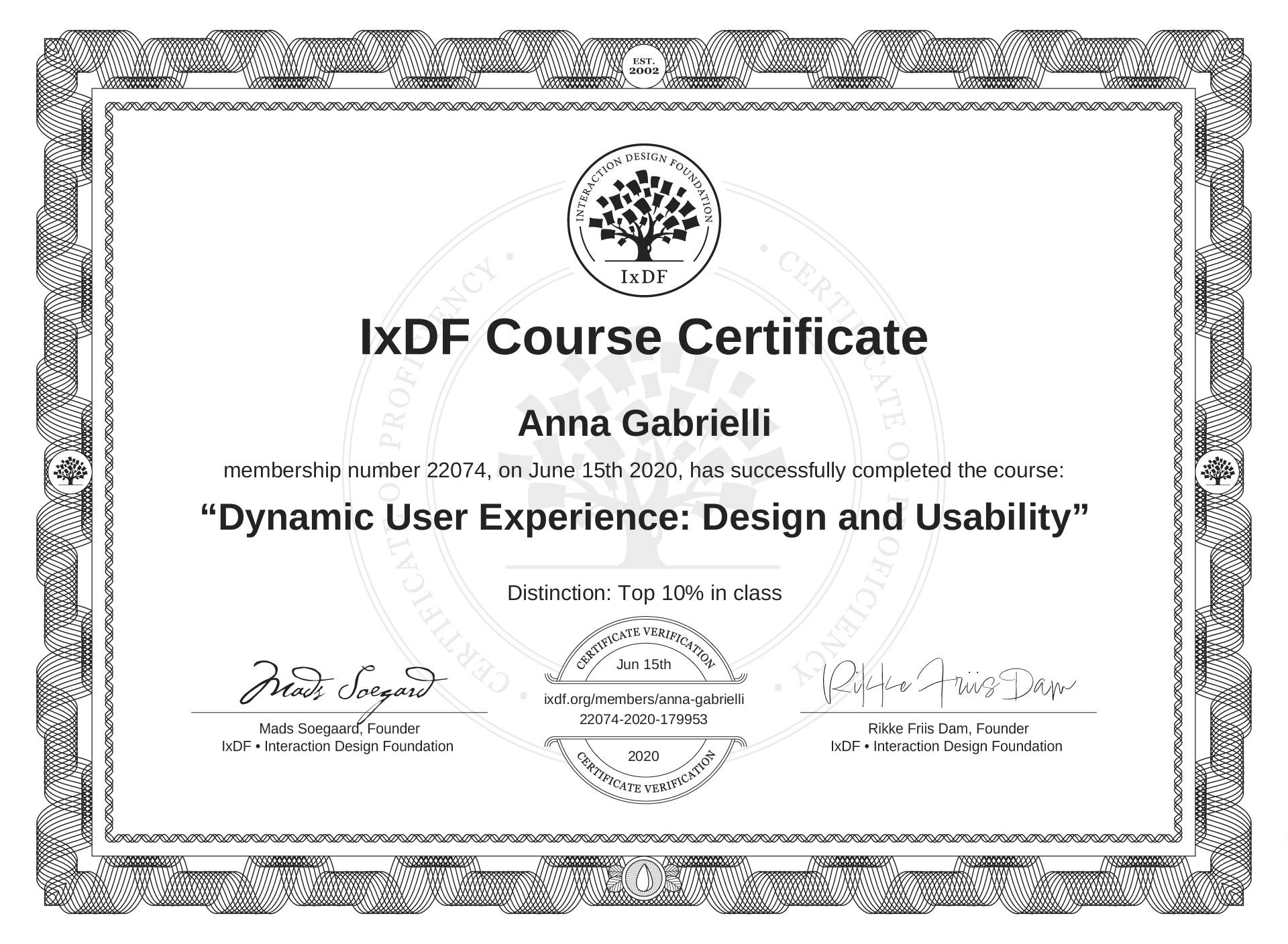 The IxDF Course Certificate (ID #84fdb213-ba92-447e-869a-b5902ddcead7) above is awarded to Anna Gabrielli with a Top 10% Distinction in formal recognition of their coursework surpassing the rigorous benchmarks of exceptional performance established by the IxDF Educational Codex. View Course Curriculum.