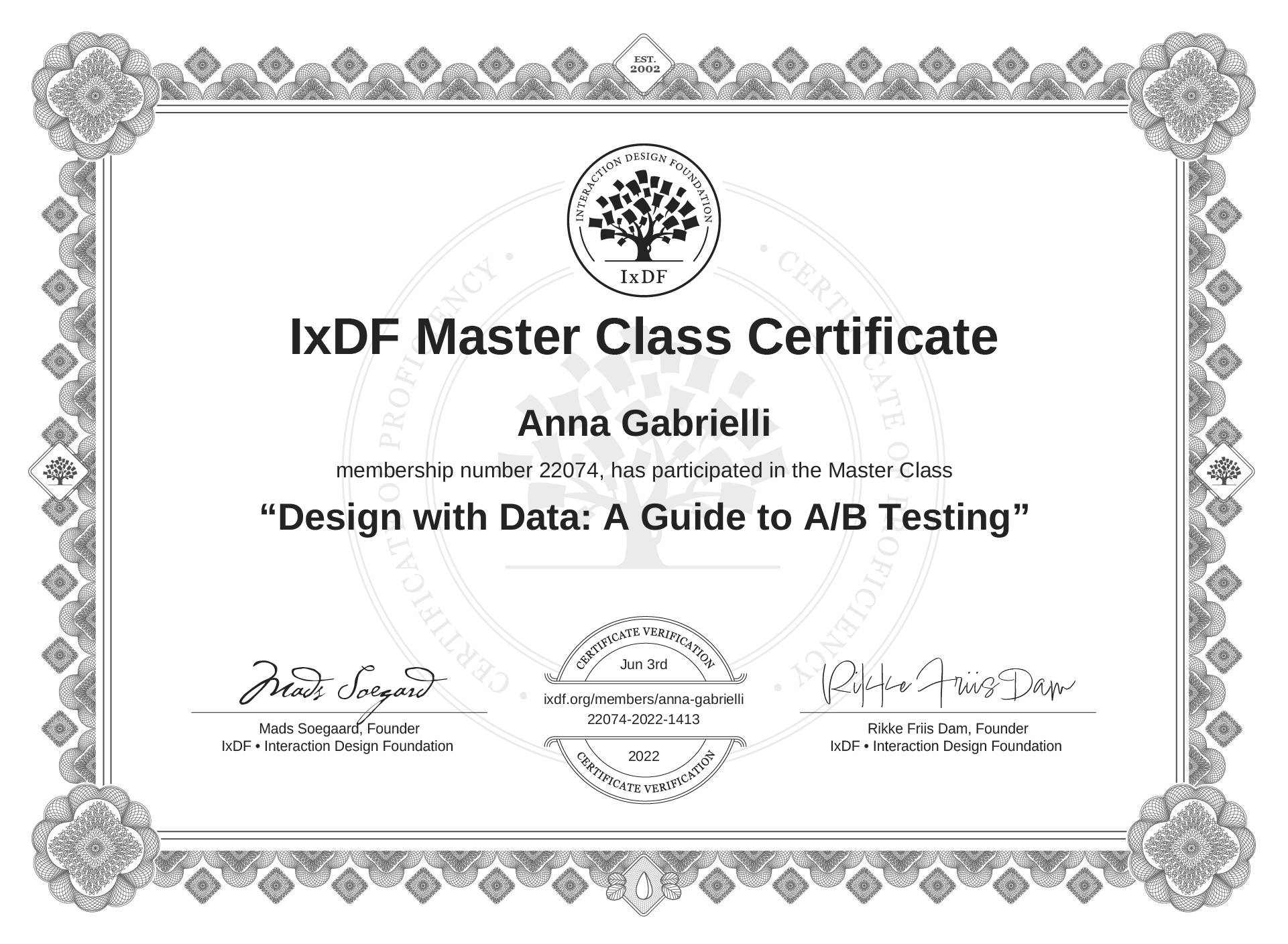 The IxDF Master Class Certificate (ID #mcc_f01691497b3f49e0ae337ad6a38e7399) above is awarded to Anna Gabrielli in formal recognition of their participation in the Master Class Design with Data: A Guide to A/B Testing .
