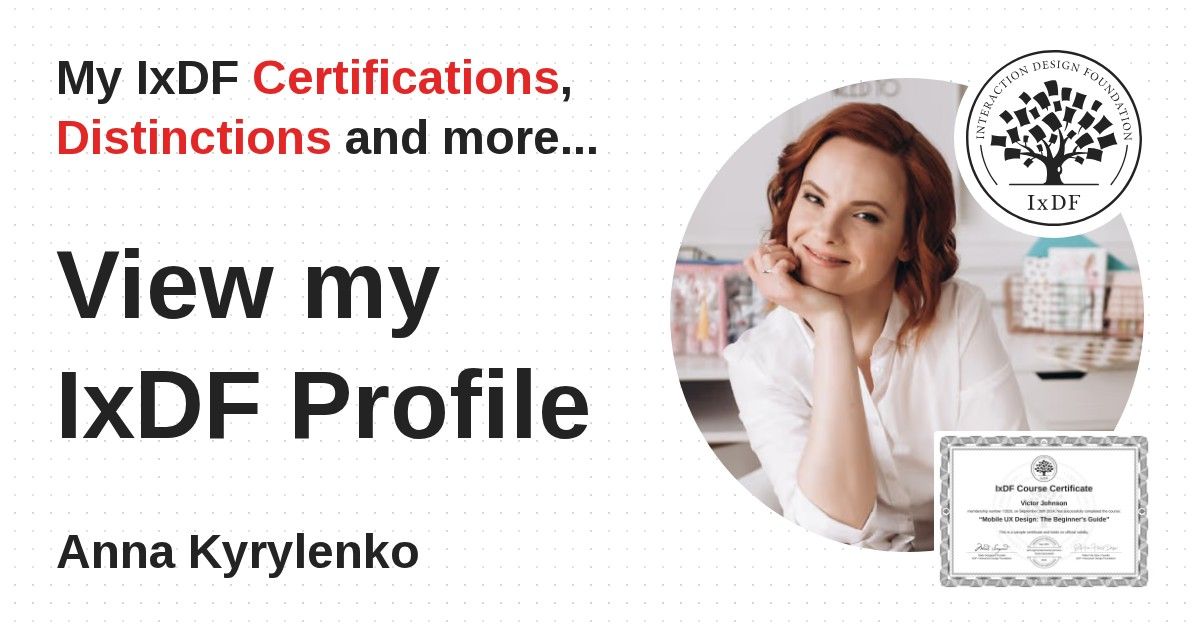 IxDF Course Certificates are awarded to Anna Kyrylenko in formal recognition of their coursework surpassing the rigorous benchmarks of exceptional performance established by the IxDF Educational Codex.