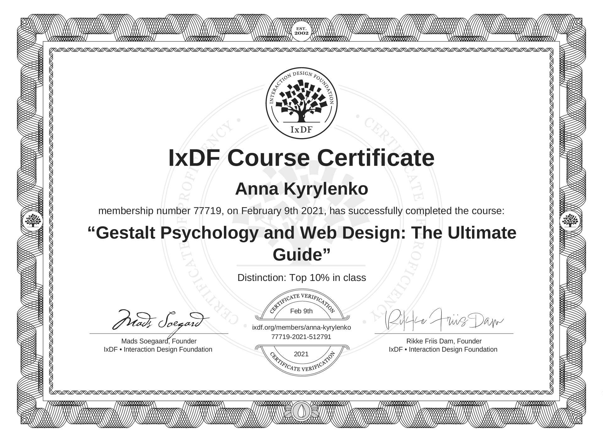 Anna Kyrylenko's Course Certificate: Gestalt Psychology and Web Design: The Ultimate Guide