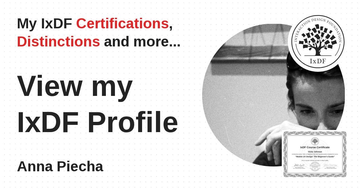 IxDF Course Certificates are awarded to Anna Piecha in formal recognition of their coursework surpassing the rigorous benchmarks of exceptional performance established by the IxDF Educational Codex.