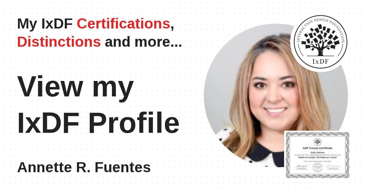 IxDF Course Certificates are awarded to Annette R. Fuentes in formal recognition of their coursework surpassing the rigorous benchmarks of exceptional performance established by the IxDF Educational Codex.