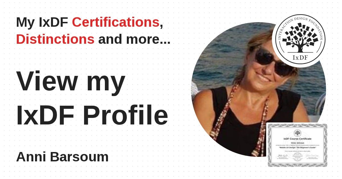 IxDF Course Certificates are awarded to Anni Barsoum in formal recognition of their coursework surpassing the rigorous benchmarks of exceptional performance established by the IxDF Educational Codex.