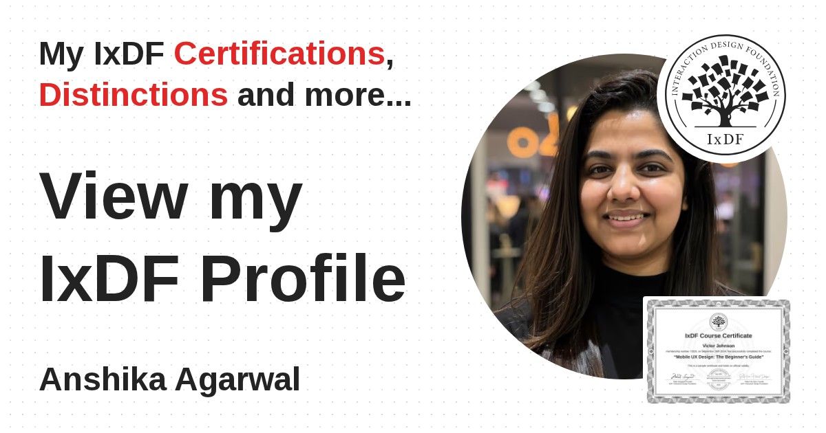IxDF Course Certificates are awarded to Anshika Agarwal in formal recognition of their coursework surpassing the rigorous benchmarks of exceptional performance established by the IxDF Educational Codex.