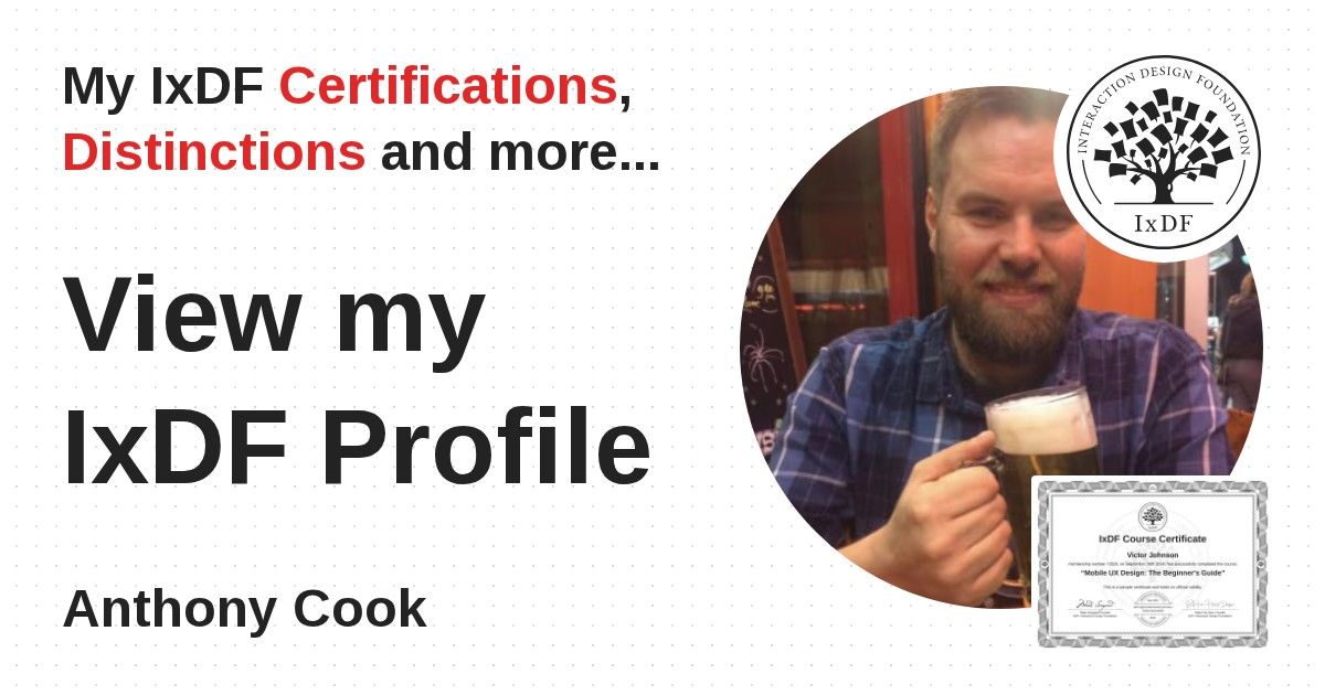 IxDF Course Certificates are awarded to Anthony Cook in formal recognition of their coursework surpassing the rigorous benchmarks of exceptional performance established by the IxDF Educational Codex.