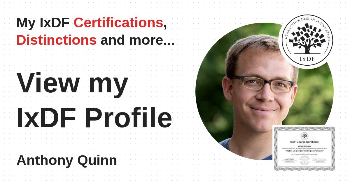 IxDF Course Certificates are awarded to Anthony Quinn in formal recognition of their coursework surpassing the rigorous benchmarks of exceptional performance established by the IxDF Educational Codex.