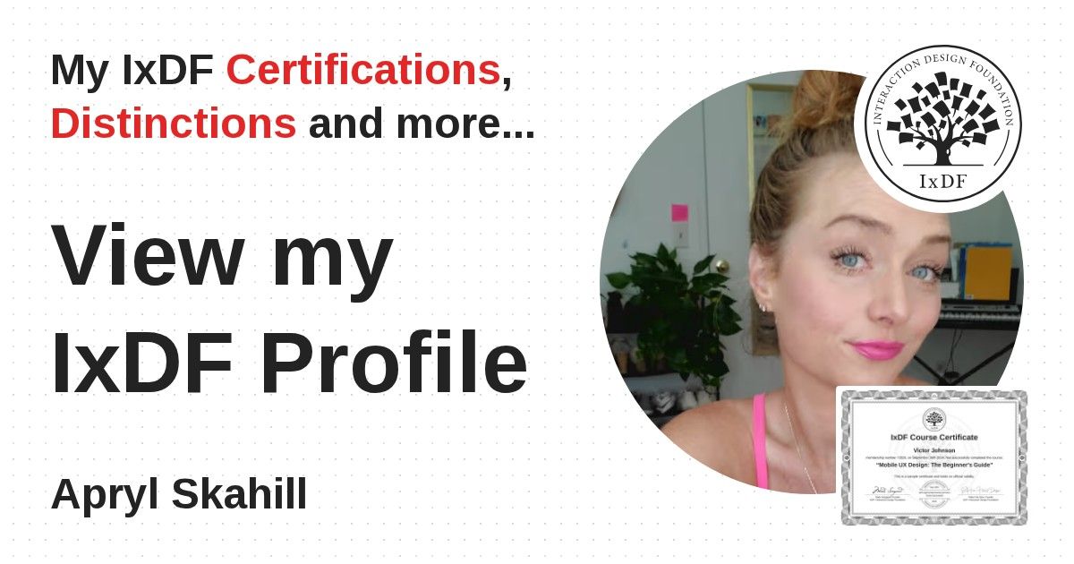 IxDF Course Certificates are awarded to Apryl Skahill in formal recognition of their coursework surpassing the rigorous benchmarks of exceptional performance established by the IxDF Educational Codex.