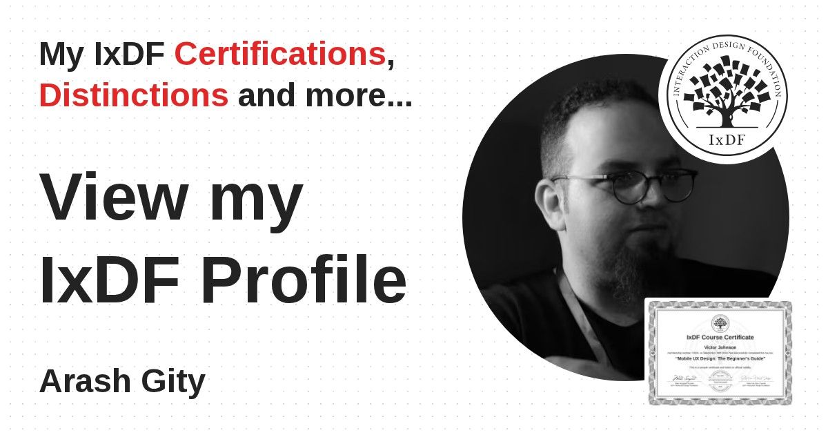 IxDF Course Certificates are awarded to Arash Gity in formal recognition of their coursework surpassing the rigorous benchmarks of exceptional performance established by the IxDF Educational Codex.