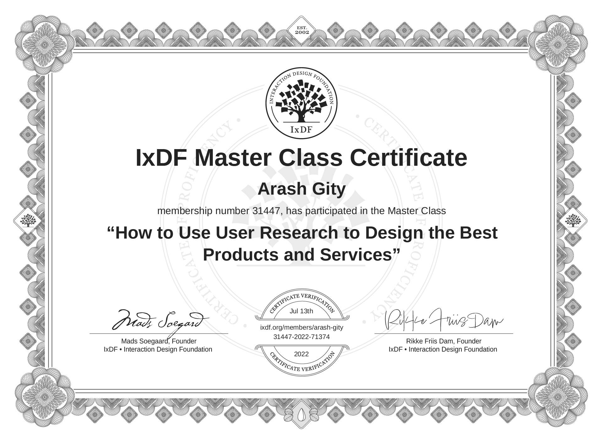 IxDF Master Class Certificates are awarded to Arash Gity in formal recognition of their attendance and ongoing commitment to learning from industry leaders.