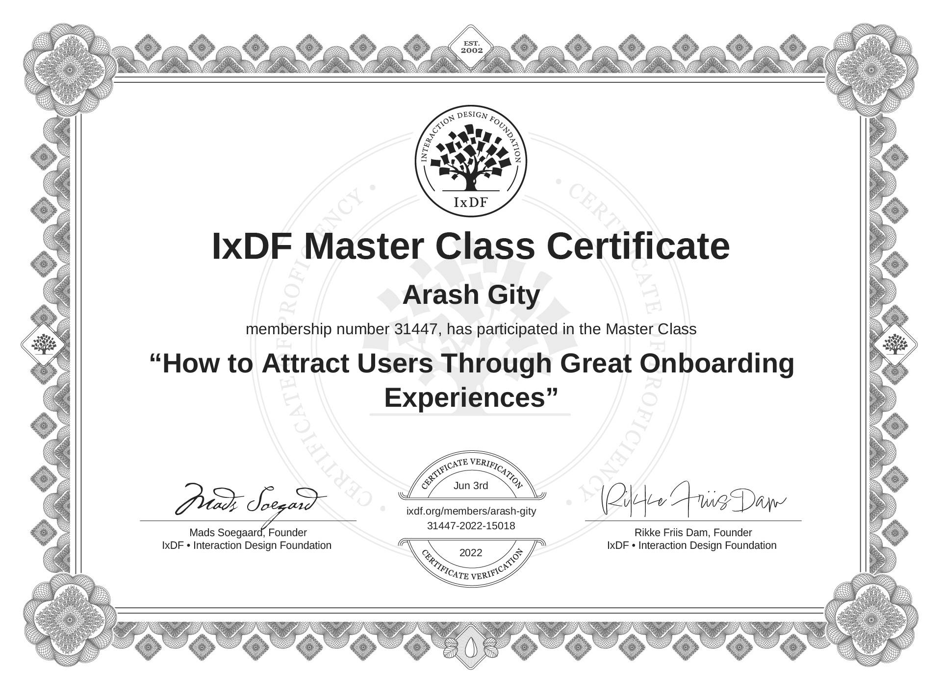 The IxDF Master Class Certificate (ID #mcc_c859559ce9054193a20ddee5ca54f0e2) above is awarded to Arash Gity in formal recognition of their participation in the Master Class How to Attract Users Through Great Onboarding Experiences .