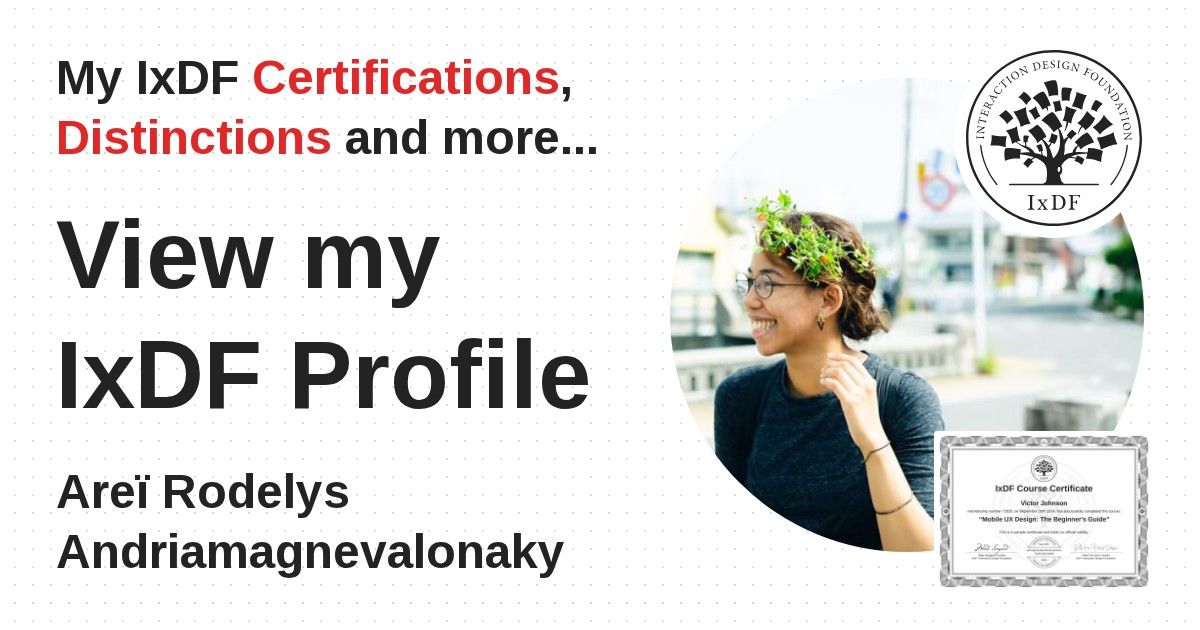 IxDF Course Certificates are awarded to Areï Rodelys Andriamagnevalonaky in formal recognition of their coursework surpassing the rigorous benchmarks of exceptional performance established by the IxDF Educational Codex.