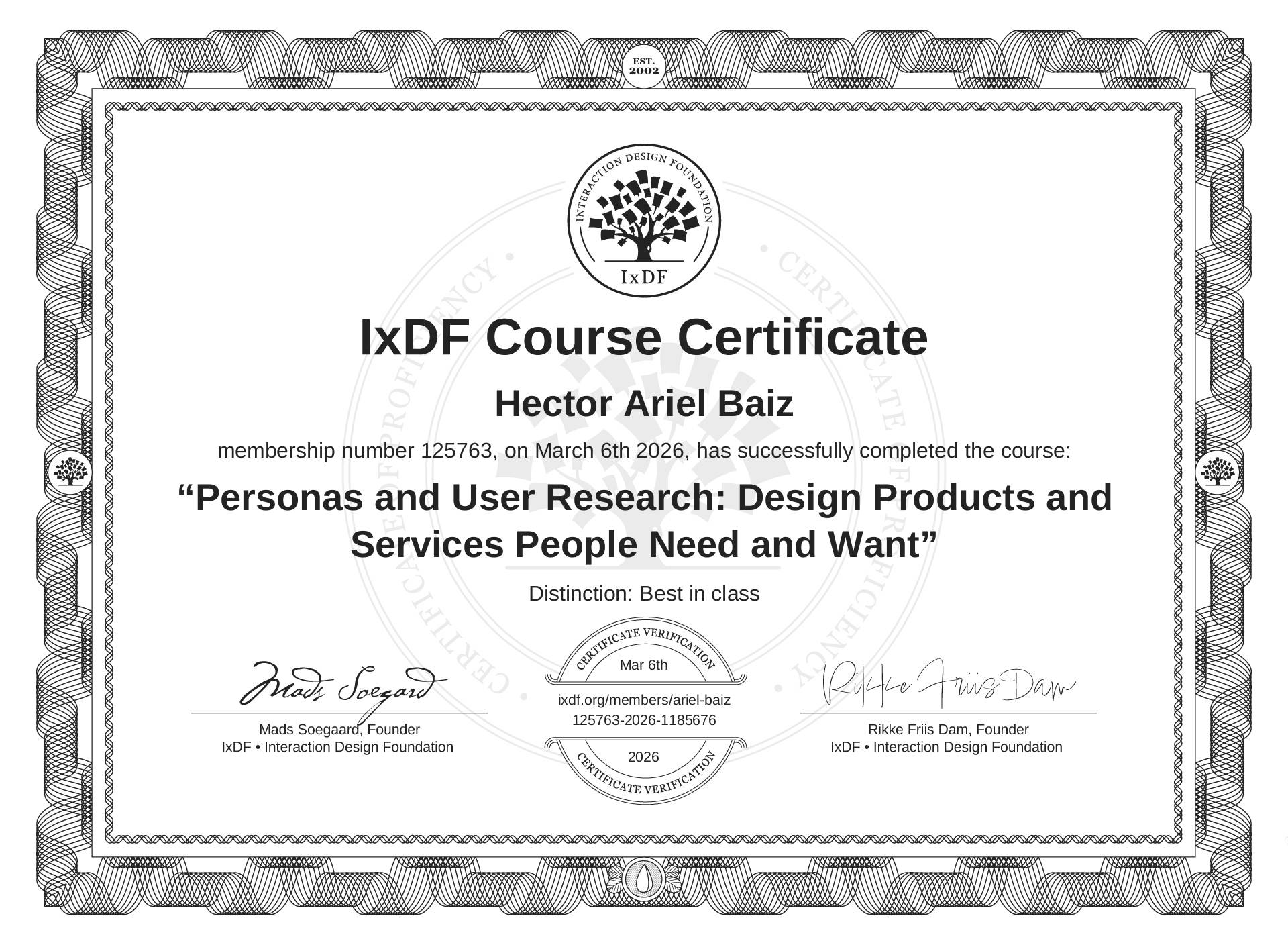 The IxDF Course Certificate (ID #56d08cf9-4f46-4738-af8e-540b9ae8e42d) above is awarded to Hector Ariel Baiz with a Best in Class Distinction in formal recognition of their coursework surpassing the rigorous benchmarks of exceptional performance established by the IxDF Educational Codex. View Course Curriculum.