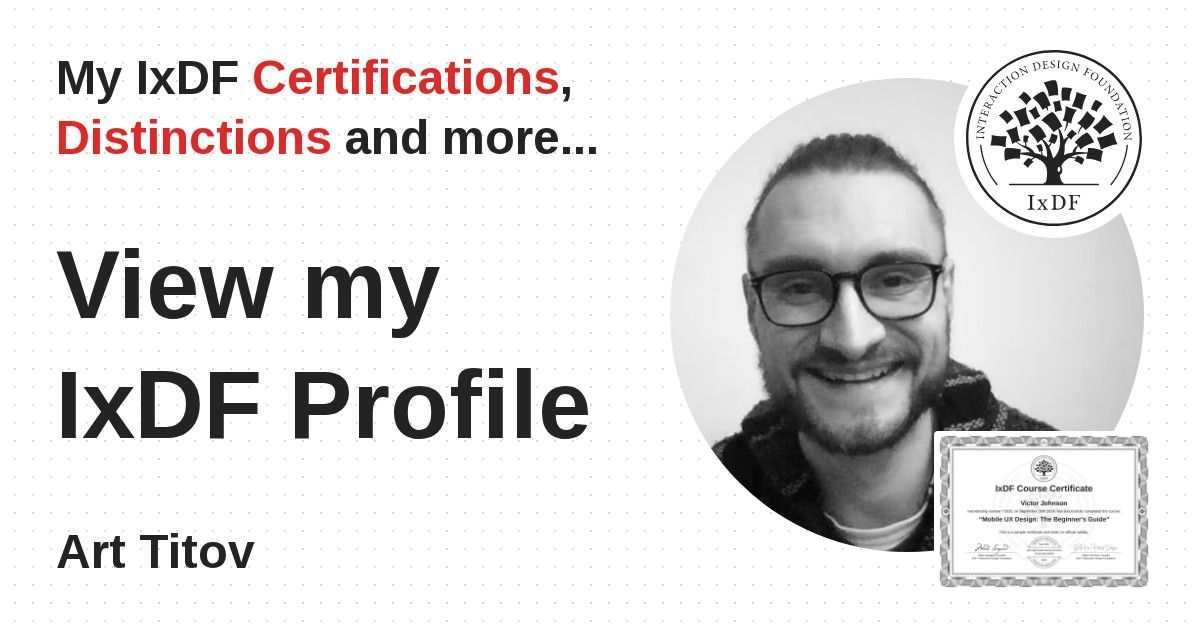 Distinctions are conferred upon Art Titov in formal recognition of their notable achievements and contributions, as stipulated by the IxDF Educational Codex.