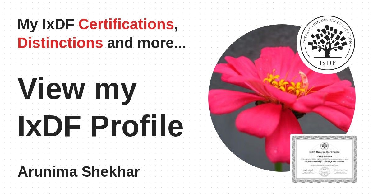 IxDF Course Certificates are awarded to Arunima Shekhar in formal recognition of their coursework surpassing the rigorous benchmarks of exceptional performance established by the IxDF Educational Codex.