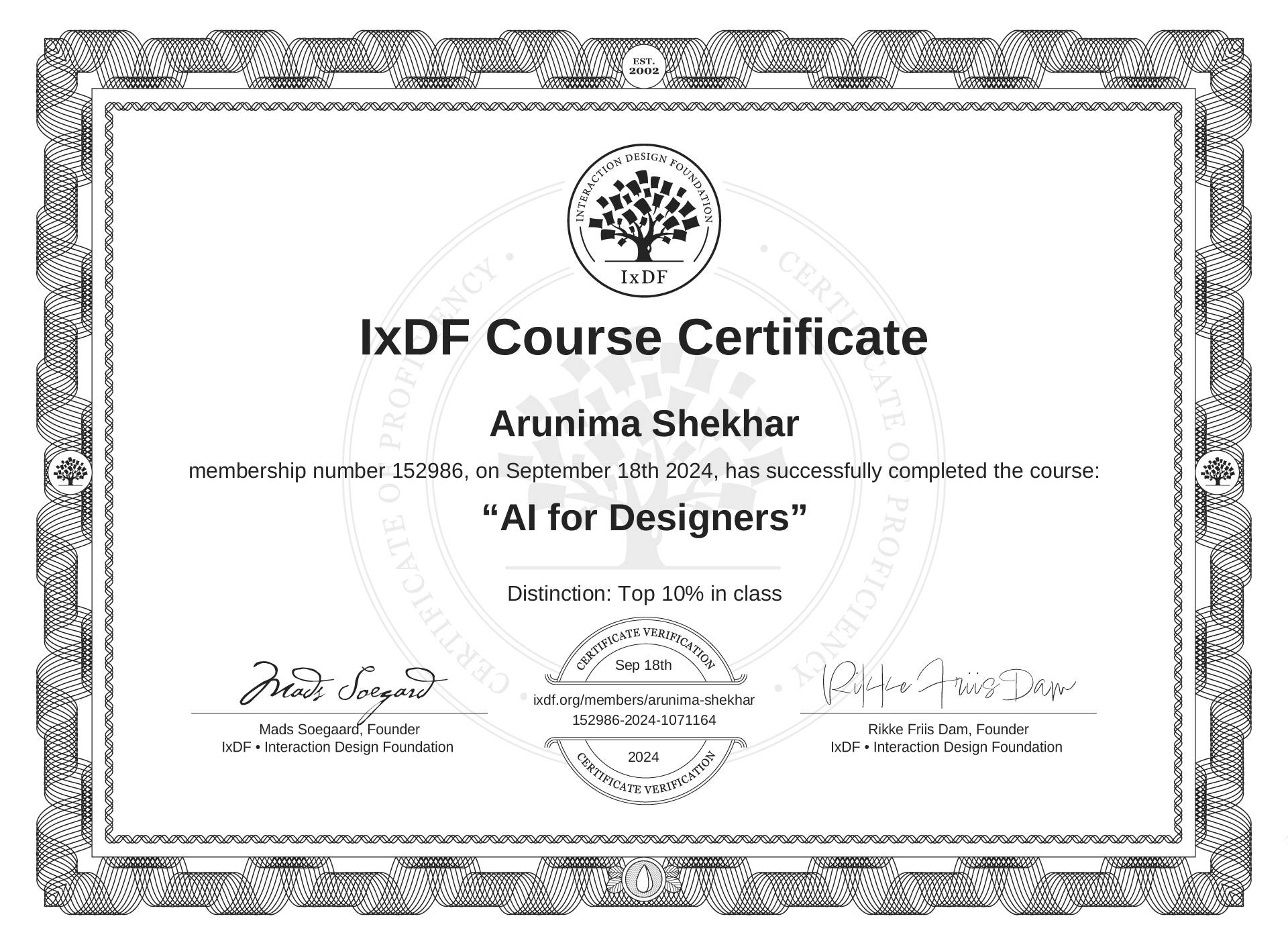 This IxDF Membership Certificate is issued to Arunima Shekhar