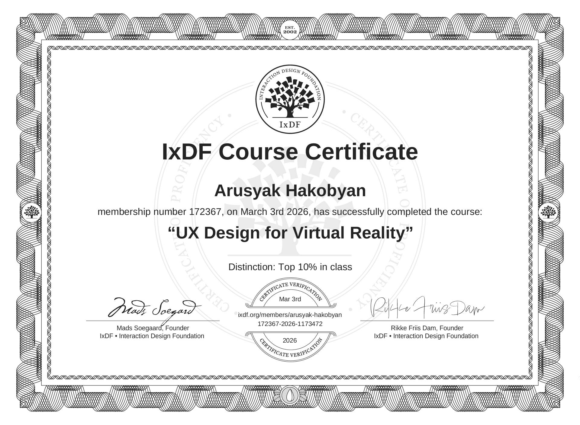 The IxDF Course Certificate (ID #ee52e1f5-f7db-4a21-8687-ad488b8ceb70) above is awarded to Arusyak Hakobyan