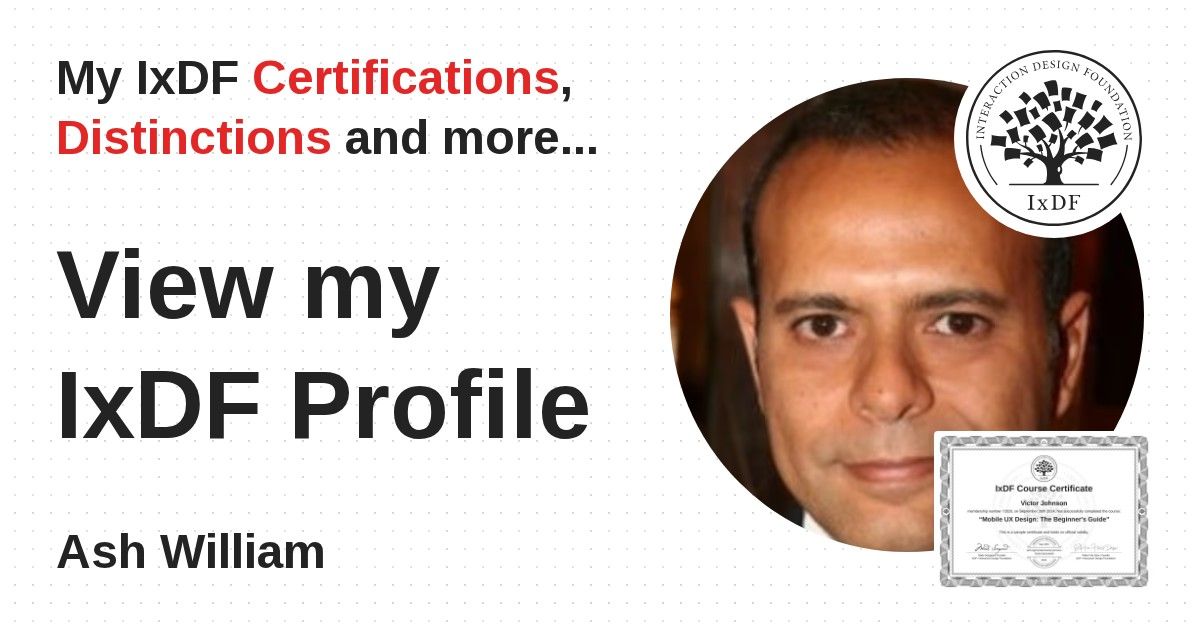 IxDF Course Certificates are awarded to Ash William in formal recognition of their coursework surpassing the rigorous benchmarks of exceptional performance established by the IxDF Educational Codex.