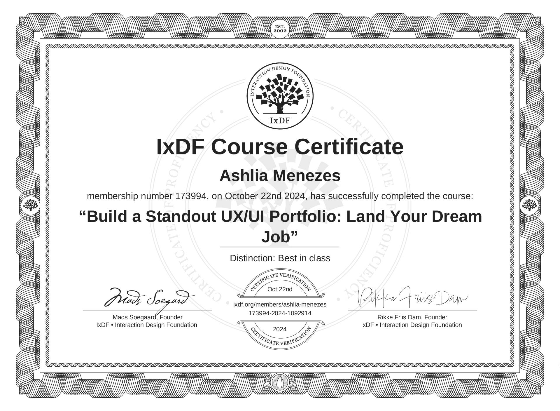 IxDF Course Certificate awarded to Ashlia Menezes for completing the "Build a Standout UX/UI Portfolio: Land Your Dream Job" course