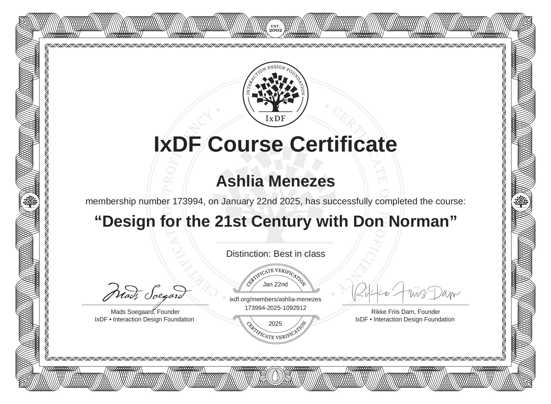 The IxDF Course Certificate (ID #972b63d5-1aa8-4587-825b-9de836106df3) above is awarded to Ashlia Menezes