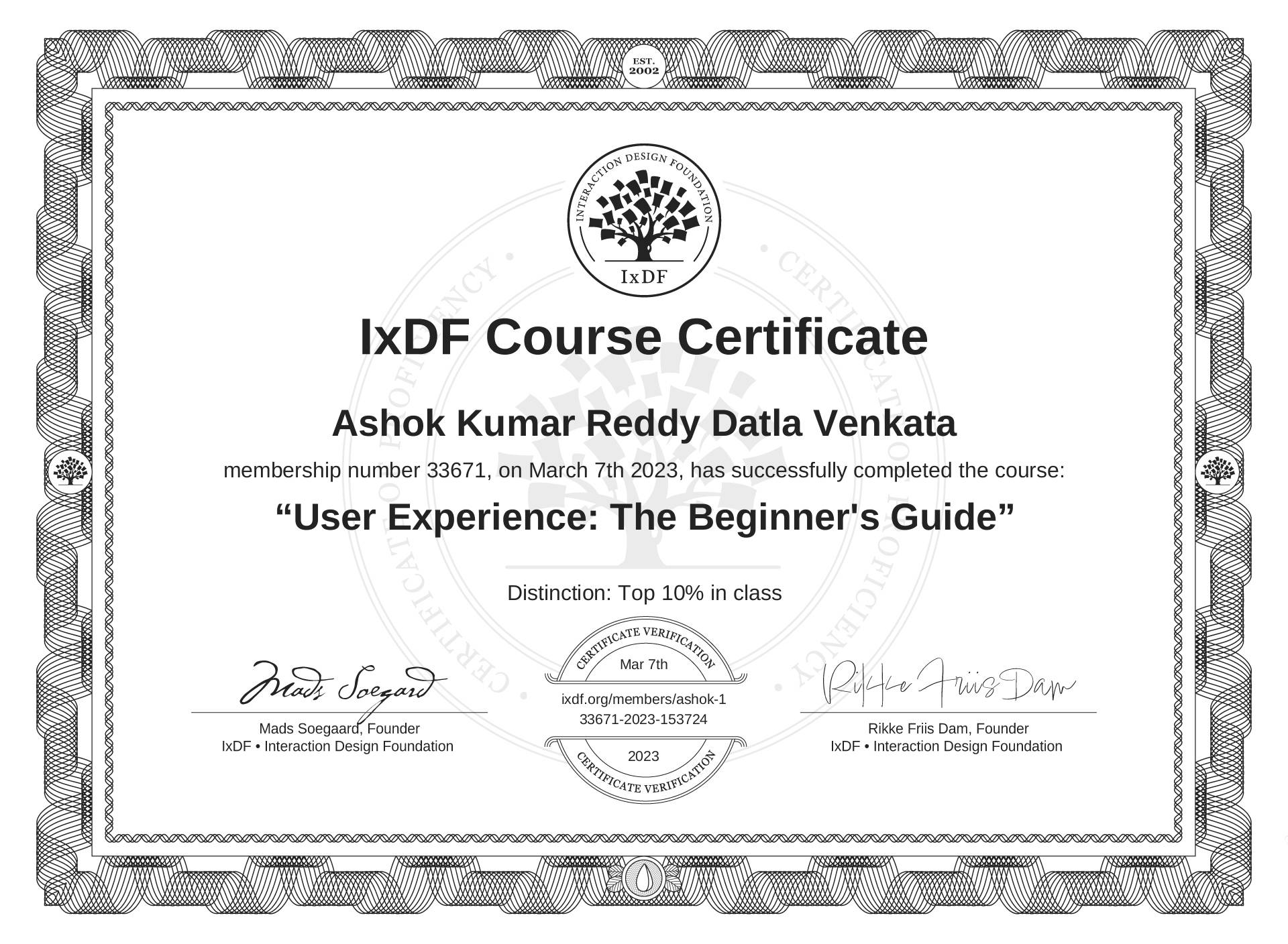 This IxDF Membership Certificate is issued to Ashok Kumar Reddy Datla Venkata