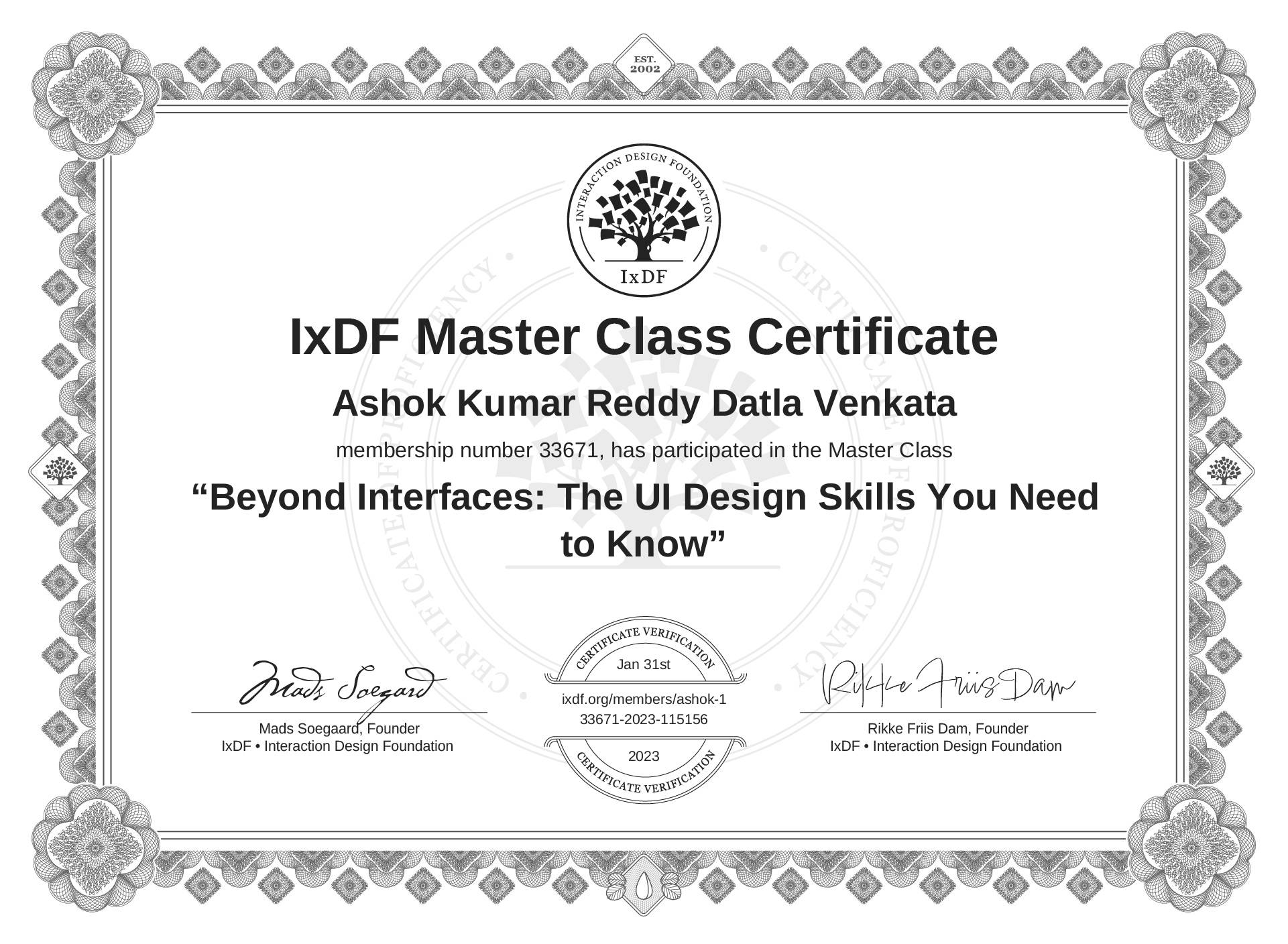 The IxDF Master Class Certificate (ID #mcc_ab1209006e344615a82ea6589ac3658d) above is awarded to Ashok Kumar Reddy Datla Venkata in formal recognition of their participation in the Master Class Beyond Interfaces: The UI Design Skills You Need to Know .