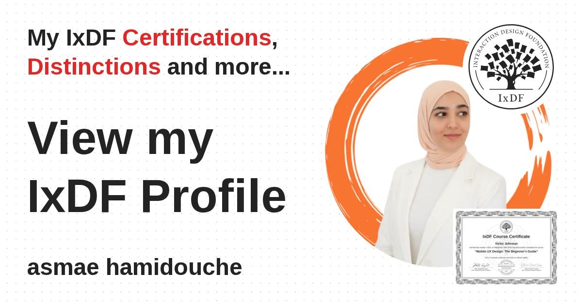 Distinctions are conferred upon asmae hamidouche in formal recognition of their notable achievements and contributions, as stipulated by the IxDF Educational Codex.