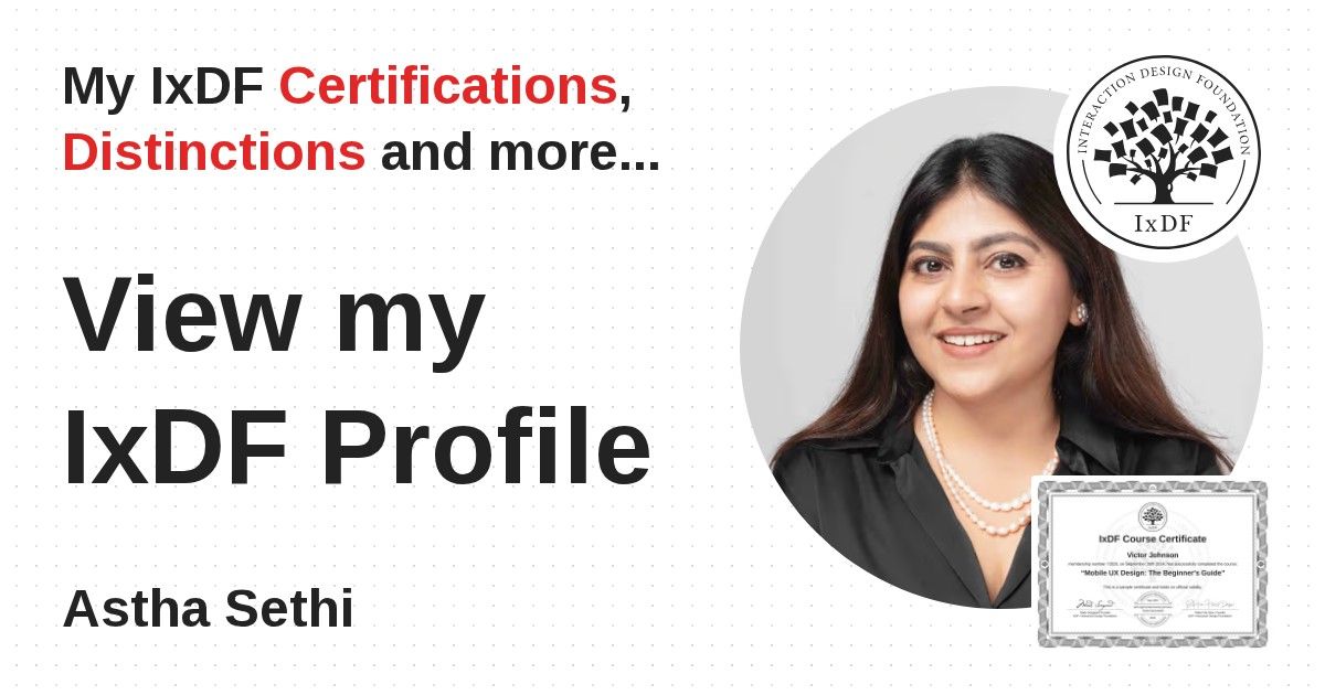 Distinctions are conferred upon Astha Sethi in formal recognition of their notable achievements and contributions, as stipulated by the IxDF Educational Codex.