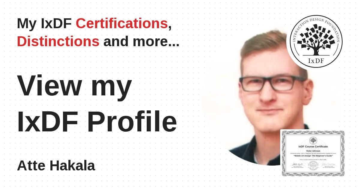 IxDF Course Certificates are awarded to Atte Hakala in formal recognition of their coursework surpassing the rigorous benchmarks of exceptional performance established by the IxDF Educational Codex.