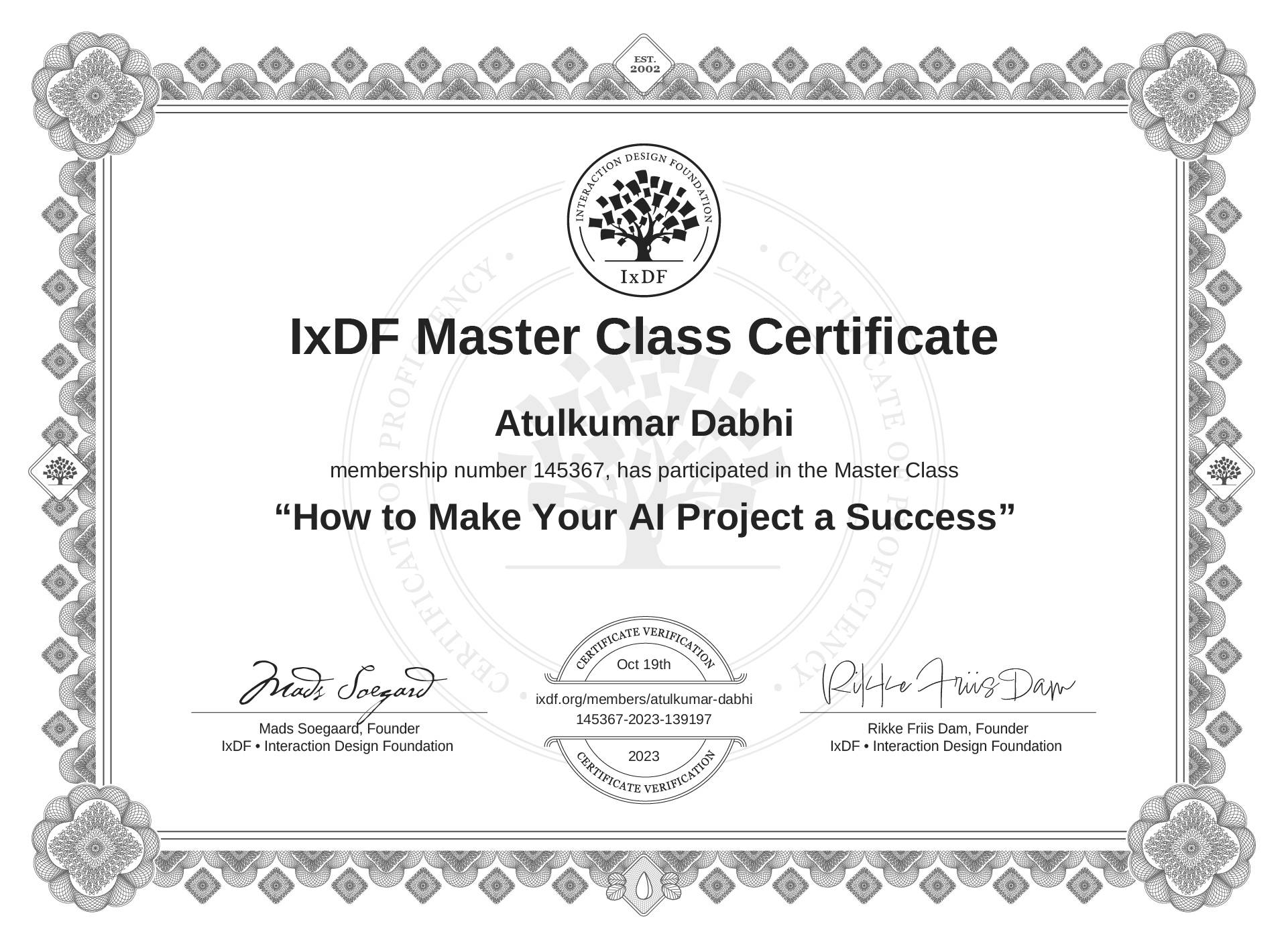 The IxDF Master Class Certificate (ID #mcc_1f78dfc91f154c47bd30e021f81389c2) above is awarded to Atulkumar Dabhi in formal recognition of their participation in the Master Class How to Make Your AI Project a Success .