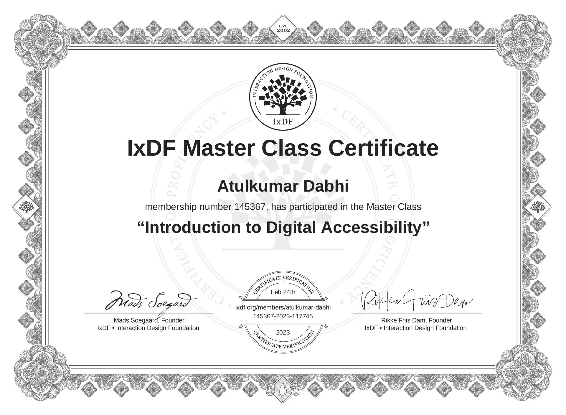 The IxDF Master Class Certificate (ID #mcc_e1a5dc9fff3c4433a21bb2756ff3a274) above is awarded to Atulkumar Dabhi in formal recognition of their participation in the Master Class Introduction to Digital Accessibility .
