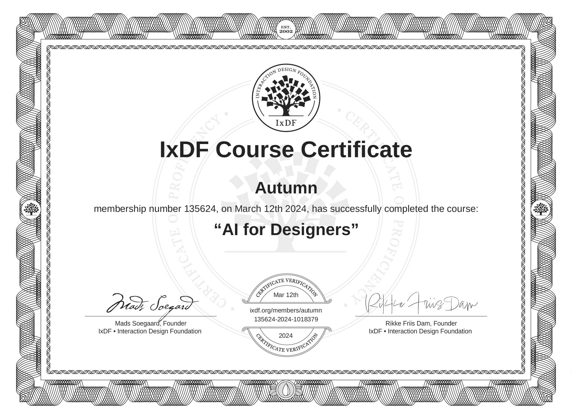 This IxDF Membership Certificate is issued to Autumn in formal recognition of their membership of the IxDF, global leader in design education.